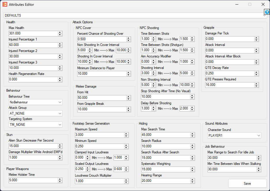 These settings define how loud the character's footsteps are to other NPCs. This is an internal sense metric, not the audio volume output by the game.