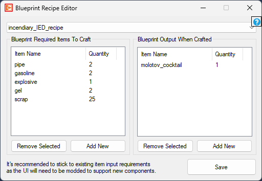 Note that adding/removing items within the recipe will not immediately reflect in the game's UI. You will need to manually edit the radial menu using the UI editor!