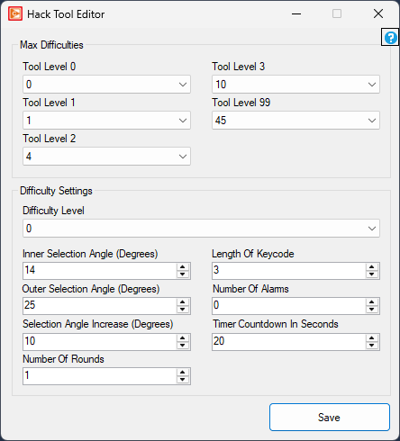 From here you will be presented with the ability to modify minigame configurations for each difficulty level and the maximum difficulty configuration used per hack tool level.