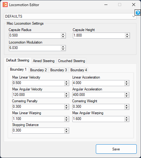 There are three types of steering boundary; default, aimed, and crouched. These are applied based on the character's state.